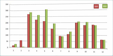 1. 春節(jié)的影響最大,兩年的情況都是:春節(jié)所在的半月,全國幾乎沒有專業(yè)展會。圖上2010年系列在6、7周幾乎沒有會,而2009年系列在4、5周幾乎沒有會,這段時間對應相應的春節(jié)。并且2010年由于春節(jié)的推后,導致其展會的恢復在第10周才開始,而09年是第8周就開始了。(當然還有天氣回暖的原因)。