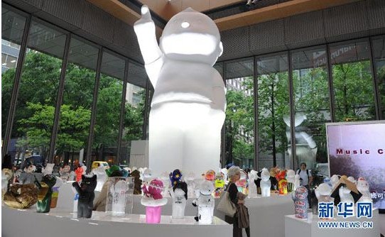 5月15日,日本東京,觀眾觀看香港、日本創(chuàng)意家以“天天向上”為主題的創(chuàng)意雕塑作品。當天,為慶祝中國香港特別行政區(qū)成立15周年,由香港特別行政區(qū)東京經(jīng)濟貿(mào)易代表部主辦的“天天向上”創(chuàng)意雕塑展在東京舉行。展覽以香港藝術(shù)家榮念曾創(chuàng)作的5米高“天天向上”創(chuàng)意毛坯雕塑為主題,并展示了來自中國香港和日本的藝術(shù)家在毛坯雕塑上繪制的不同表情和服飾的130件作品。(來源:新華網(wǎng))