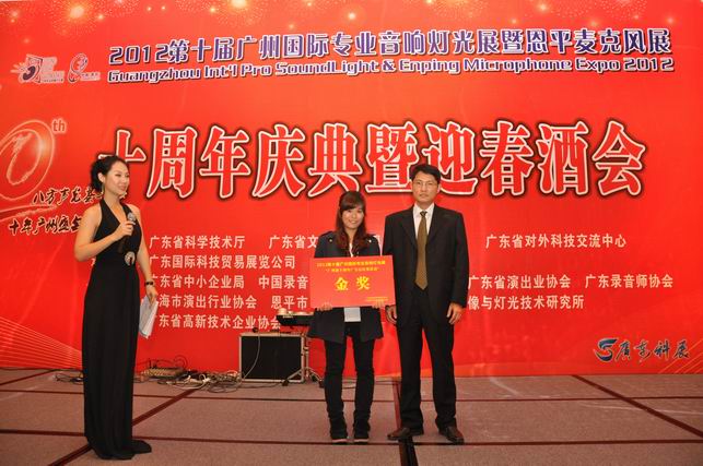 圖:2012第十屆廣州專業(yè)音響、燈光展十周年廣告語(yǔ)征集活動(dòng)金獎(jiǎng)得主頒獎(jiǎng)