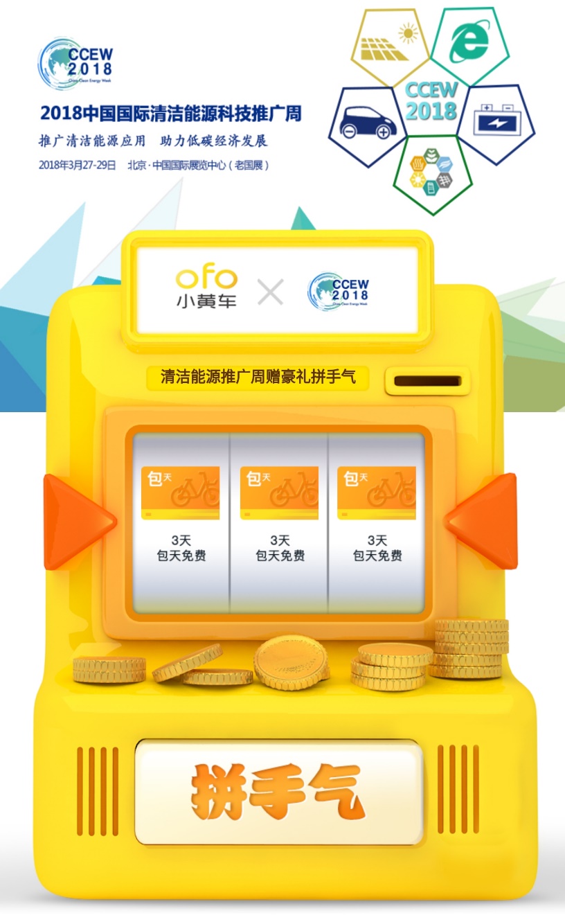熟悉小黃車的用戶都知道,月卡和騎行券一直是ofo的固定福利模式,而全新上線的手氣卡,則將ofo的福利資源進行了全面整合。手氣卡是一個包含月卡、周卡、騎行券、折扣券等多重優惠福利的大禮包,用戶通過老虎機搖獎即可隨機獲得不同種類的優惠獎品。參與2018中國國際清潔能源科技推廣周與ofo小黃車聯名手氣卡的方式非常簡單,活動期內,用戶可通過推廣周官方微博、微信、EDM等平臺找到活動消息: