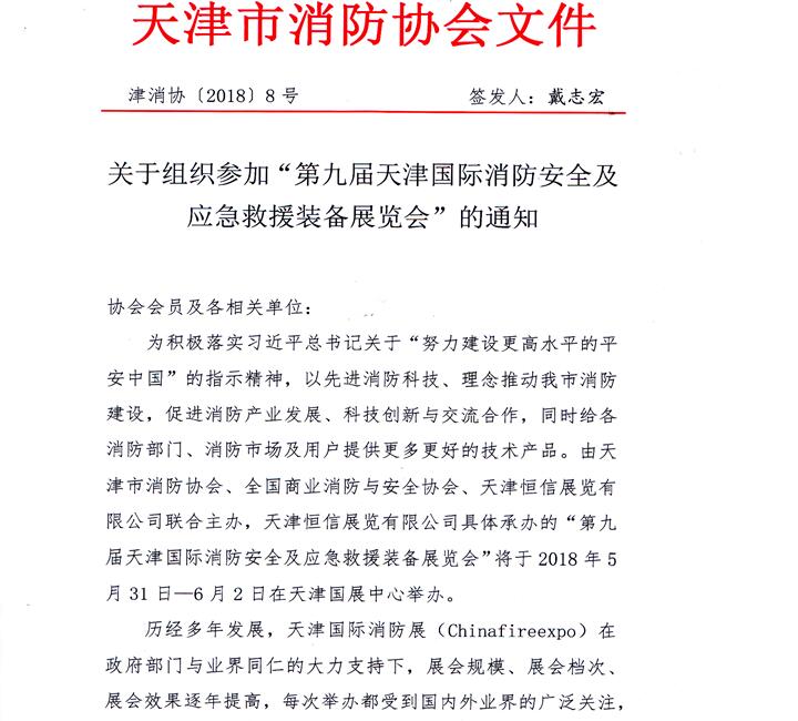 天津市消防協會-關于主辦2018第九屆天津消防展的通知