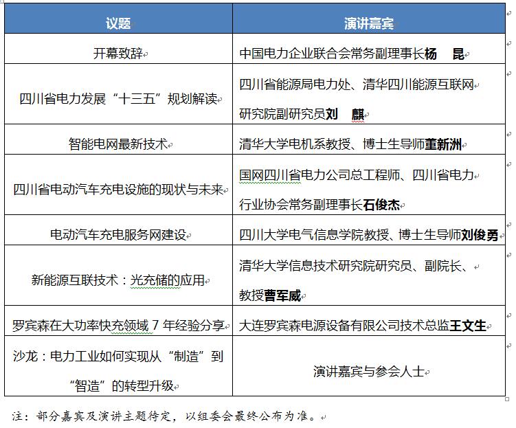 論壇上,清華大學電機系教授、博士生導師,北京市綠色能源與電力安全國際科技合作基地主任董新洲,清華大學信息技術研究院研究員、副院長、教授,清華華泰新能源互聯技術研發中心主任,北京智中能源互聯網研究院首席科學家曹軍威,四川大學電氣信息學院教授、博士生導師,智能電網四川省重點實驗室主任劉俊勇,四川省能源局電力處、清華四川能源互聯網研究院副研究員劉麒,四川省經濟和信息化委員會電力處調研員王衛,四川省電力行業協會常務副秘書長文曹,國網四川電動汽車服務有限公司總經理王華,四川省電工技術學會副理事長兼秘書長王健,成都市電力行業商會會長陳素清,成都市電力行業協會會長廖赤軍,成都市公共交通集團有限公司副總經理鄭之旭、大連羅賓森電源設備有限公司技術總監王文生等行業領軍人士將同臺深入交流,解讀政策規劃和行業發展趨勢,分享技術創新和產品研發成果。