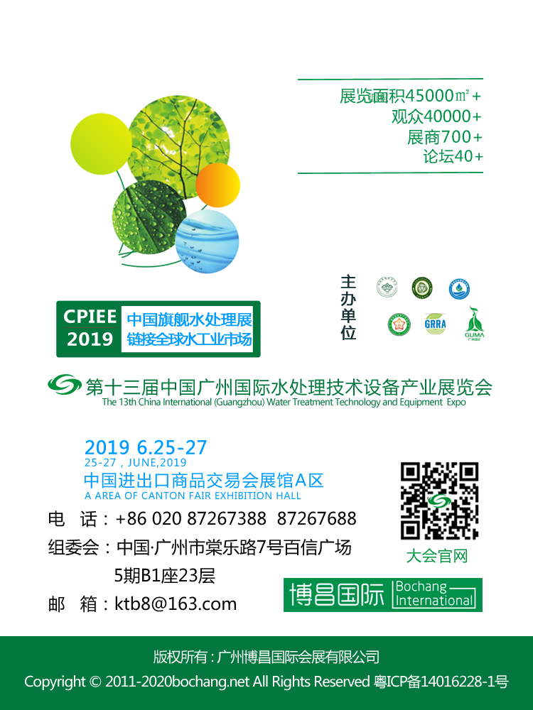 第十三屆中國國際廣州水處理技術設備展覽會暨2019“一帶一路”環保創新創業大會于2019年6月25-27日在廣交會展館A區隆重舉辦!以“對接粵港澳大灣區 鏈接全球環保市場”為主題,將憑借華南及粵港澳大灣區如此強大的市場優勢,以高實效為原則,貼近市場、服務客商,為展商開發多級市場,鏈接全球水工業市場商機!這一屆的展會規模、品質、衍生服務再次全面升級,45000㎡展示規模,預計吸引700多家品牌企業參展及4萬名專業觀眾參觀,全面展示水與污水處理技術設備、泵管閥、膜與海水淡化、雨水收集與利用/洪水控制、黑臭水體防治及河域治理、水質監測、環境服務等水工業全產業鏈的前沿技術與最佳解決方案。同期40多場高規格、高標準的專業學術論壇,展會影響力深度擴大到華南及東南亞地區,促進國際交流合作,助力水處理產業再添生輝。