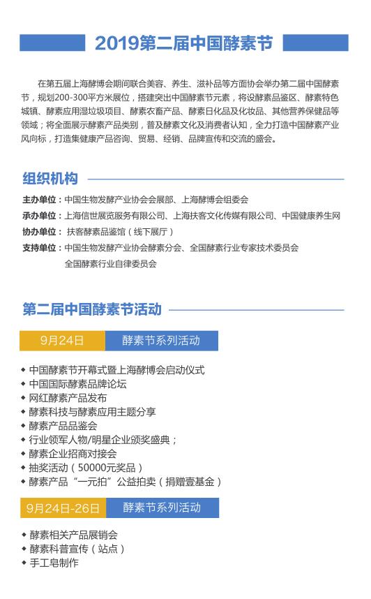 而協會及委員會全力支持召開的“2019第五屆上海酵博會之第二屆中國酵素節”展覽活動將于2019年9月24-26日在上海新國際中心隆重召開。由中國生物發酵產業協會主辦,上海酵博會組委會與上海扶客文化傳媒有限公司承辦,扶客酵素品鑒館、中國健康養生網協辦,獲得中國酵素城、養生天下、山東天隨、恒利康、大漢酵素、中山生津、山東飛龍、佳聯、海濟潤生、六和果、浙江藴本、山東博華、良田集團、蔻拉蜜、美瘦生物、西沙諾麗等多家知名伙伴支持,及騰訊、搜狐、新浪等30多家知名媒體支持。規模十分龐大,歡迎全球范圍的營養健康、美容、養生、保健行業從業者、愛好者等伙伴們前來參加。