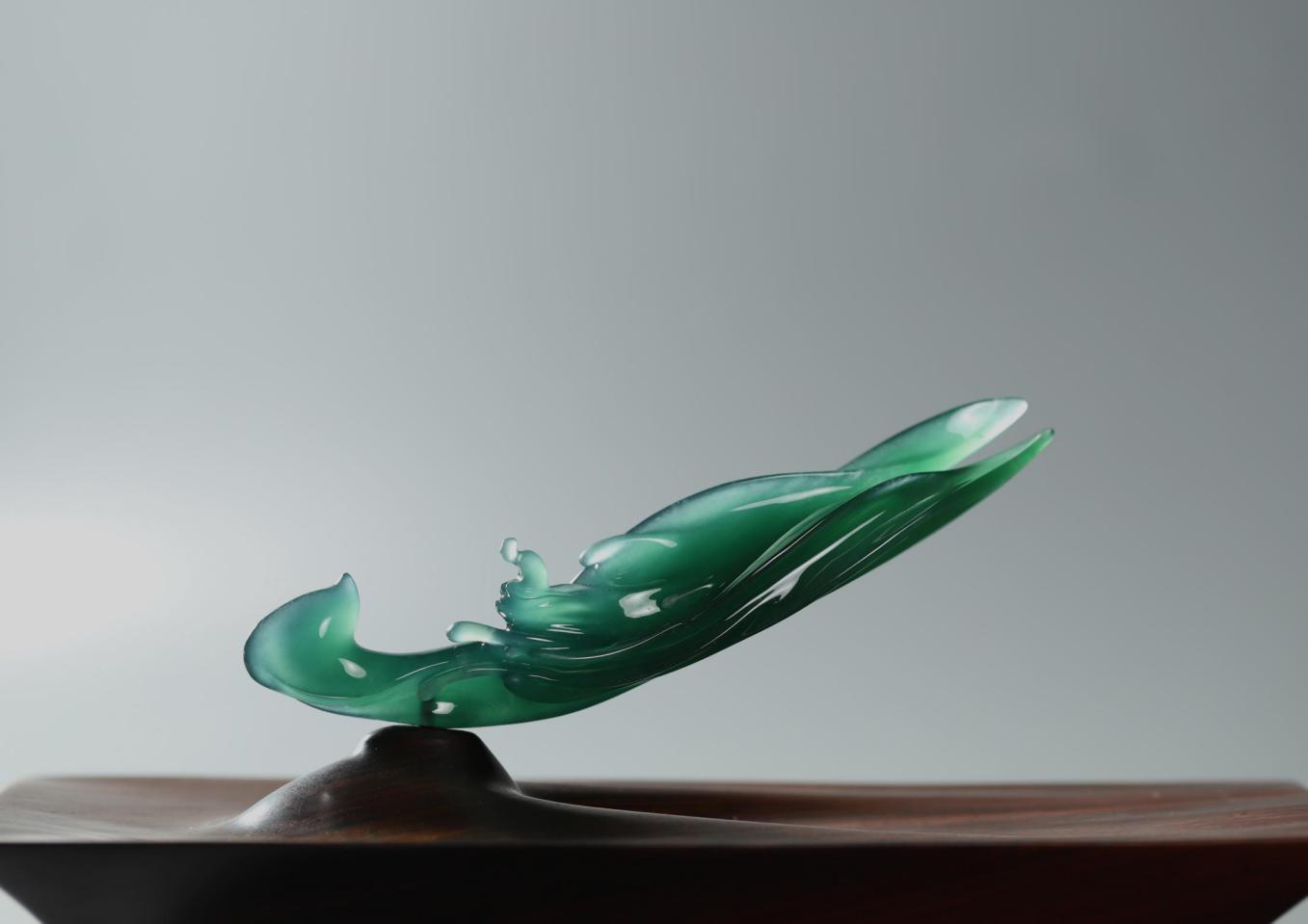 化境系列,意在還原翡翠中自然天成的美感。結合其質,形,色,意,以流暢的線條,呈現玉石雅致清逸,意境空明的天然之美。該系列作品造型抽象,在純凈靈透中展現空靈寂靜之美。在清心自由的狀態中,加以想象,感知,它或是水,是魚,是舞者,是一切生靈……成萬物之法變,應無所住而通其心,遂漸入佳境。