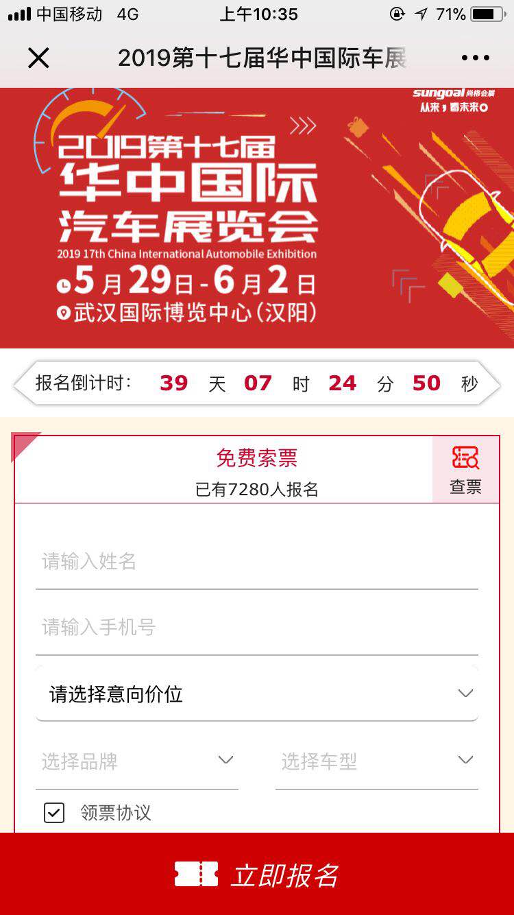 1、進(jìn)入“華中國際車展”官方微信,點(diǎn)擊“免費(fèi)索票”,填寫并提交報(bào)名信息,以便客服聯(lián)系您發(fā)送門票。