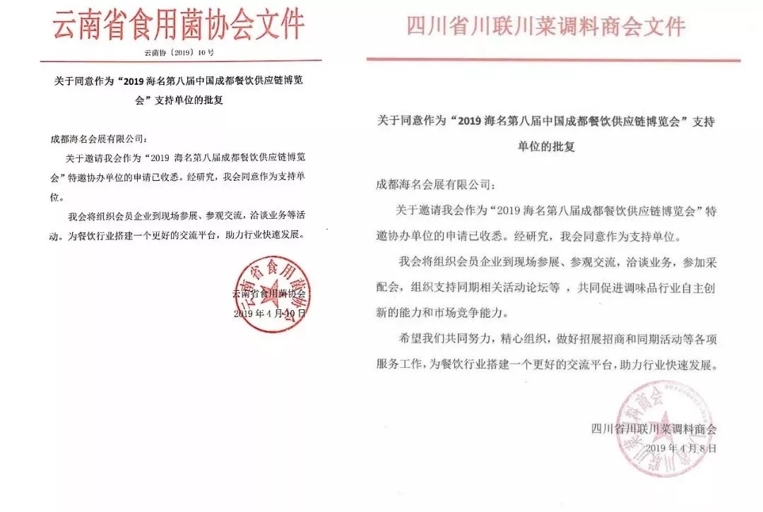【朱臺鎮行業商會、全國工商聯廚具商會西部工作站、成都市水產行業協會、云南省食用菌協會、四川省川聯川菜調料商會 復函】