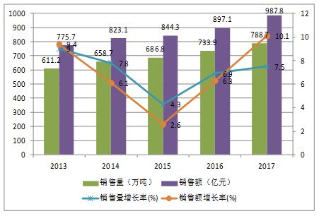 根據(jù)中國膠粘劑和膠粘帶工業(yè)協(xié)會的統(tǒng)計數(shù)據(jù),2013-2017年中國膠粘劑和密封劑行業(yè)一直保持著增長的勢頭。2017年膠粘劑與密封劑的銷售量、銷售額分別為788.7萬噸、987.8億元,分別增長7.5%和10.1%。這充分說明了2017年面對嚴峻形勢和艱難挑戰(zhàn),我國膠粘劑行業(yè)不斷提升質量控制和技術管理水平,產(chǎn)業(yè)結構調整穩(wěn)步推進,行業(yè)發(fā)展的技術基礎進一步增強。