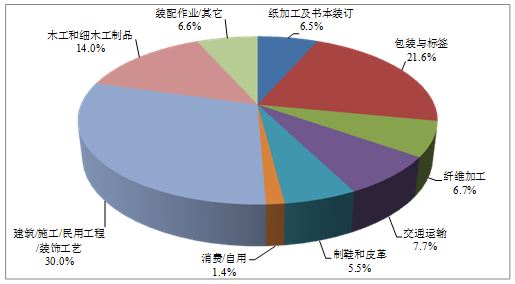膠粘劑應用市場增長最快的應用領域是建筑/施工/民用工程/裝飾工藝,占總應用市場的30%,而包裝與標簽用膠占21.6%,木工和細木工制品用膠占14.0%,交通運輸用膠占7.7%。纖維加工、裝配作業(yè)、紙加工及書本裝訂、制鞋和皮革這四個領域,分別占5.5?6.7%之間。