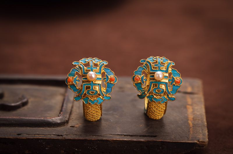 耳環引用傳統蝙蝠、團壽、祥云等吉祥圖案,藍色部分采用點翠工藝,點綴珍珠等有機寶石,圈體為手工花絲,整體工藝細膩,搭配完美堪稱完美之作。