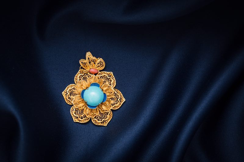 蝴蝶和花面均為手工花絲之作,點綴天然松石和有機寶石等,整體造型優雅美麗,細膩繁復,富有古韻的時尚作品。