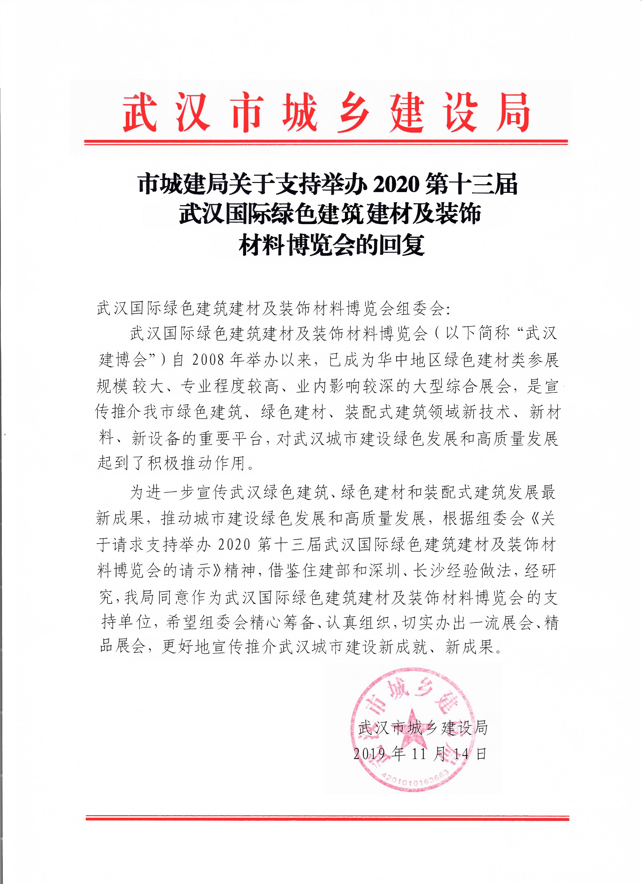 日前,武漢市城建局做出決定,全力支持2020第十三屆武漢國際綠色建筑建材及裝飾材料博覽會(簡稱:武漢建博會)做大做強,并下文回復,強調要切實辦出一流展會、精品展會,更好宣傳推介武漢城市建設新成就、新成果。