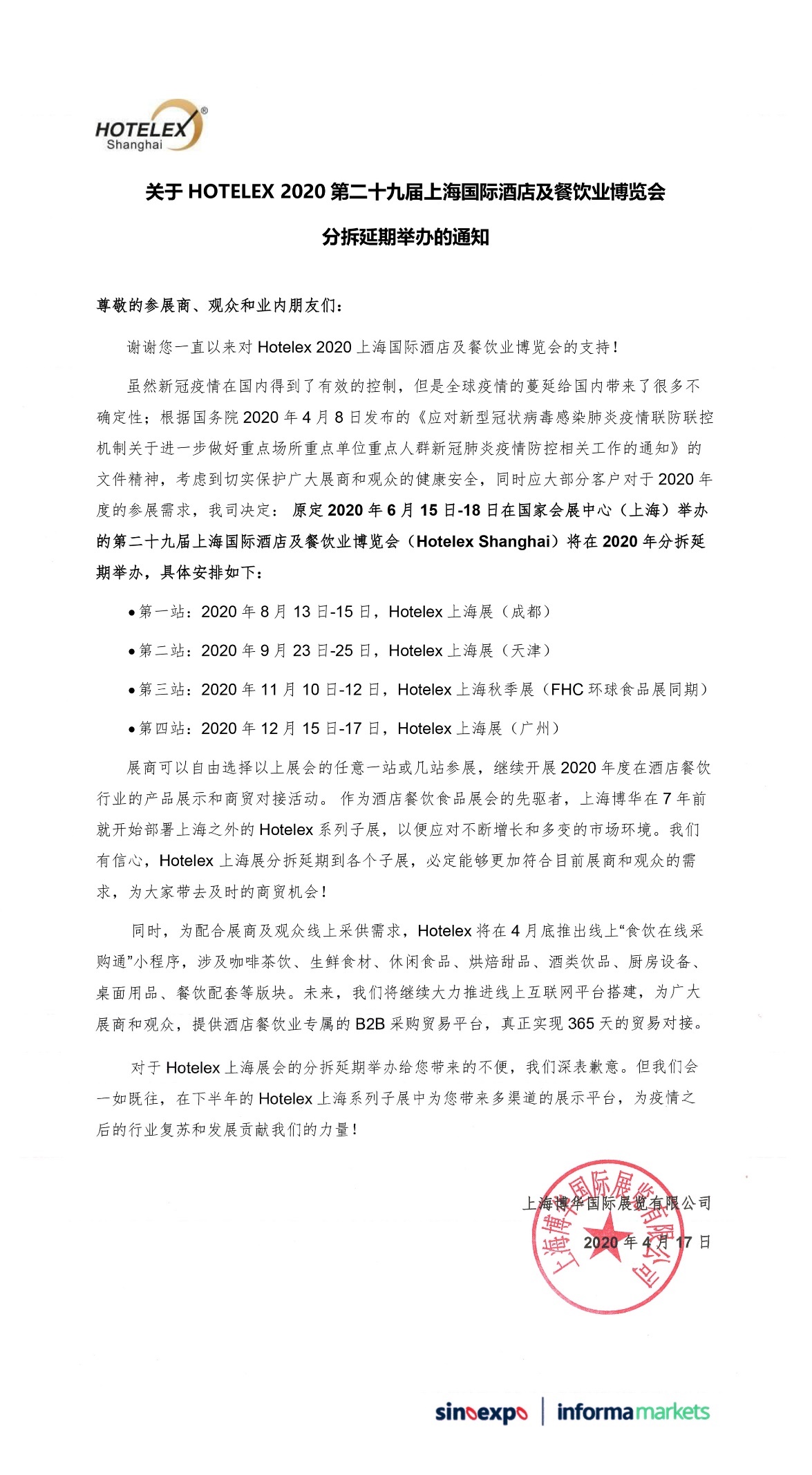 第二十九屆上海國際酒店及餐飲業博覽會分拆延期通知