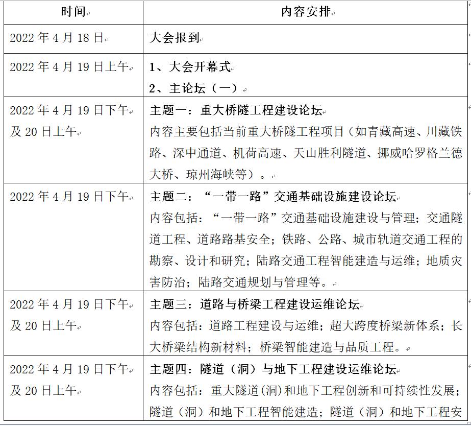 大會期間擬組織橋隧重大工程建設成就及技術創新展,充分展示我國過去十年橋梁、隧道等交通基礎設施建設和“一帶一路”發展過程中取得的重大成就和涌現出的技術創新成果,以期推動我國橋隧交通基礎設施行業發展與技術進步。
