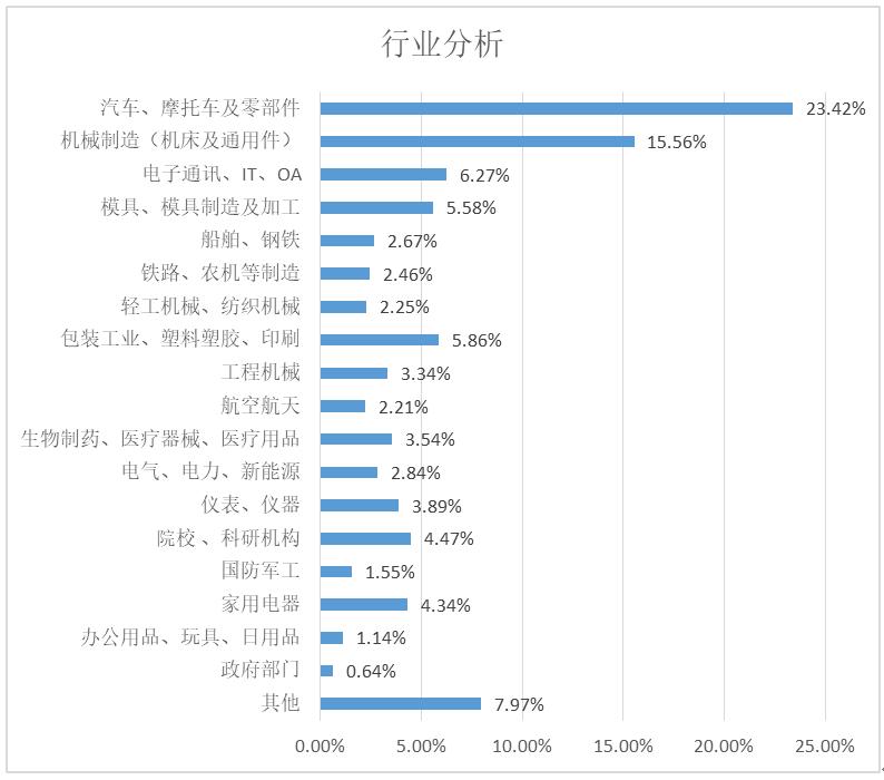 參觀展會(huì)的企業(yè)行業(yè),以汽車、摩托車及零部件企業(yè)最多,占到總數(shù)的23.42%,其次為機(jī)械制造(機(jī)床及通用件),占15.56%。此外,電子通訊、模具、船舶、鋼鐵、鐵路、農(nóng)機(jī)、輕工、橡塑包裝、工程機(jī)械、國防軍工、航空航天、生物醫(yī)藥、家電等制造行業(yè)均有涉及。