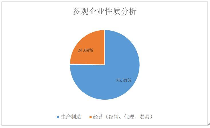 據(jù)展會(huì)組委會(huì)統(tǒng)計(jì),本次展會(huì)參觀企業(yè)達(dá)6341家,從企業(yè)性質(zhì)總數(shù)量占比來看,生產(chǎn)制造企業(yè)占75.31%,經(jīng)營(經(jīng)銷、代理、貿(mào)易)企業(yè)占24.69%,兩者合計(jì)占100%。由此可以看出,在參觀企業(yè)中,以生產(chǎn)制造企業(yè)為主,占比較大。