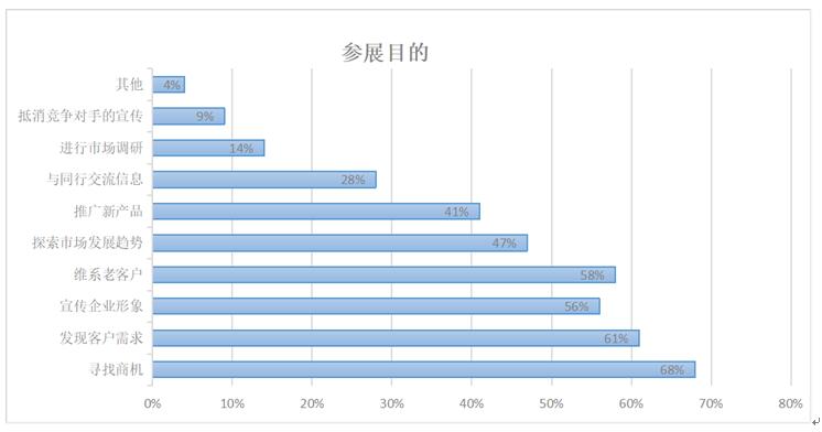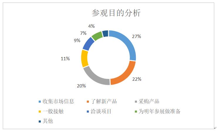 專業(yè)觀眾的參觀目的有“收集市場(chǎng)信息”“了解新產(chǎn)品”“采購產(chǎn)品” “一般接觸”“洽談項(xiàng)目”“為明年參展做準(zhǔn)備”,比重依次降低。