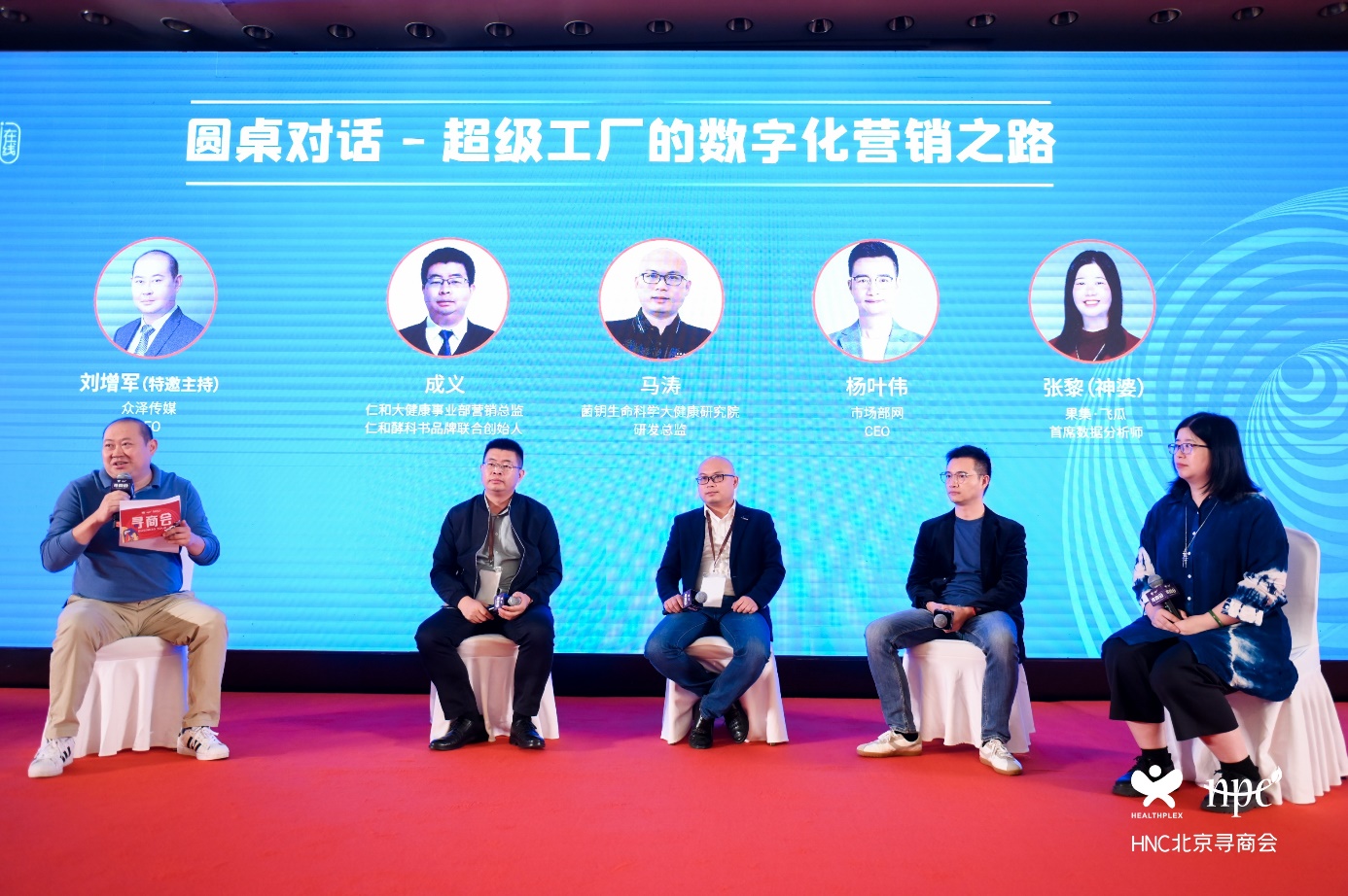 從左至右:眾澤傳媒CEO劉增軍(主持)、仁和大健康事業(yè)部營(yíng)銷(xiāo)總監(jiān) 、仁和酵科書(shū)品牌聯(lián)合創(chuàng)始人成義、菌鑰生命科學(xué)大健康研究院研發(fā)總監(jiān)馬濤、市場(chǎng)部網(wǎng)CEO楊葉偉、果集•飛瓜首席數(shù)據(jù)分析師 神婆