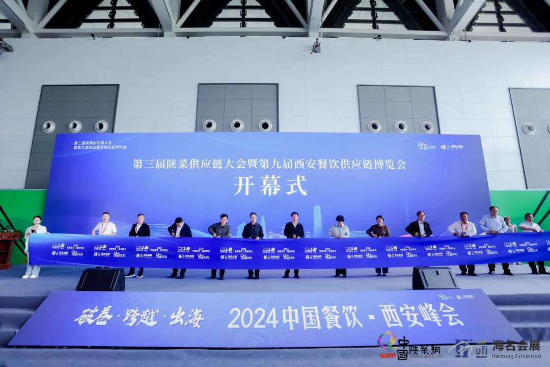 陜西省商務廳副廳長郭紹敏;陜西省三秦文化研究會會長張社年;西安市商務局一級調研員陸晴;陜西省三秦文化研究會副會長、陜西金控集團原董事長權永生;陜西省三秦文化研究會副會長王宏;陜西省三秦文化研究會副會長、陜西旅游集團總經理任公正;重慶市小面協會會長張壽江;蘭州烹飪協會會長趙順謙;陜味食族油潑面創始人陳雷;深圳老碗會創始人楊富強;陜西省餐飲聯合會駐會會長黨小兵;西安飯店與餐飲行業協會會長王小唐共同剪彩,第三屆陜菜供應鏈大會暨海明·2024第9屆西安餐飲供應鏈博覽會正式啟動。